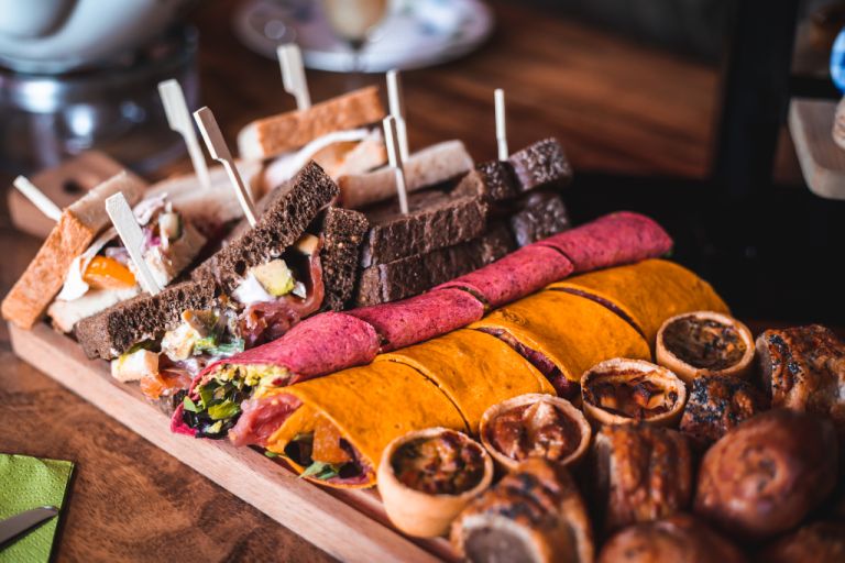 We starten de high tea met een bouillon als cappuccino, gevolgd door hartige en zoete lekkernijen zoals wraps, scones, en mini gebakjes. We sluiten af met een petit dessert. Er is een ruime keuze aan thee en water met munt en citroen. De high tea duurt ongeveer 2,5 uur en moet minimaal 24 uur van tevoren gereserveerd worden